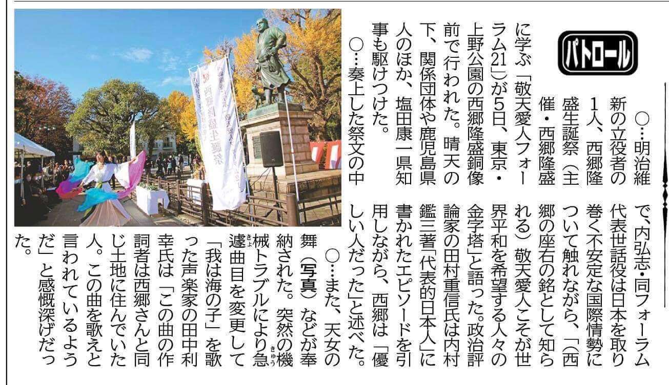 昴を歌う予定でカラオケを用意しましたが機械が反応せず急遽思い付きで「われは海の子」をアカペラで披露しましたが、その作詞者が近年西郷隆盛の生家から200mの家の出身の児童文学者「宮原晃一郎」であることが判明したそうで偶然のことでありましたが鹿児島の人でさえあまり知られていない事なので関係者から驚きの声が上がりました。そのことを含め翌日【世界日報】に実名入りで掲載頂けました。