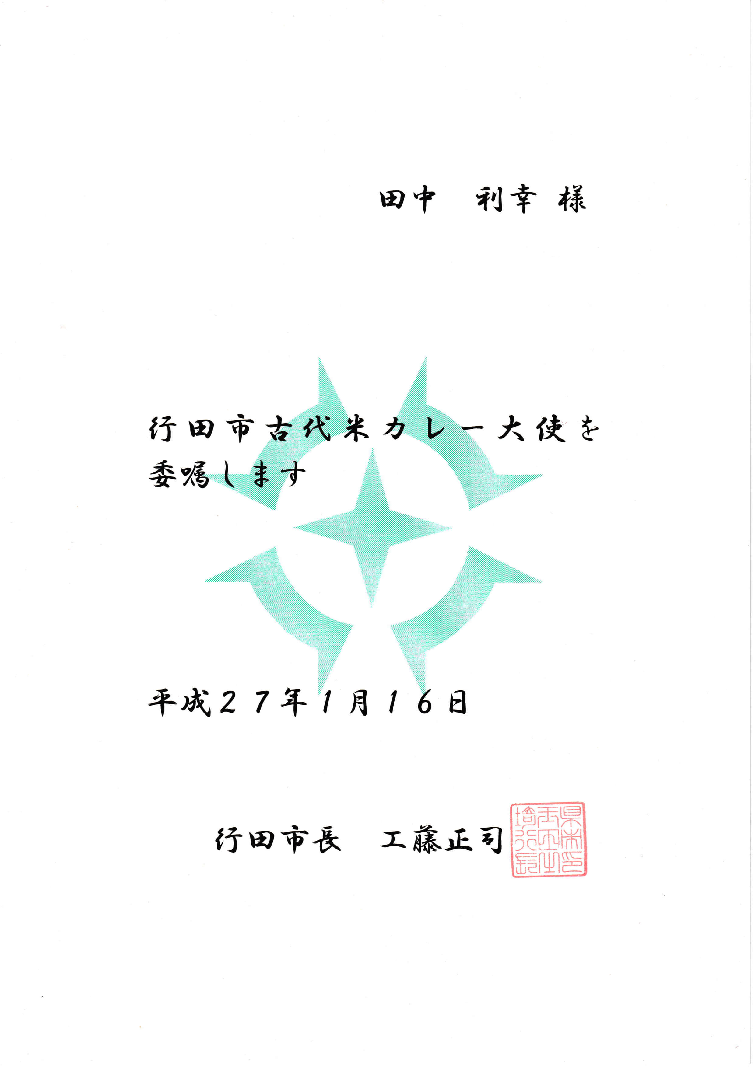 「さきたま古墳・行田古代米カレーの会」は、10年前より、田中がボランティアで立ち上げ、2015年(平成27年)には行田市長(当時の工藤正司市長)から「行田古代米カレー大使」の委嘱を受けました。