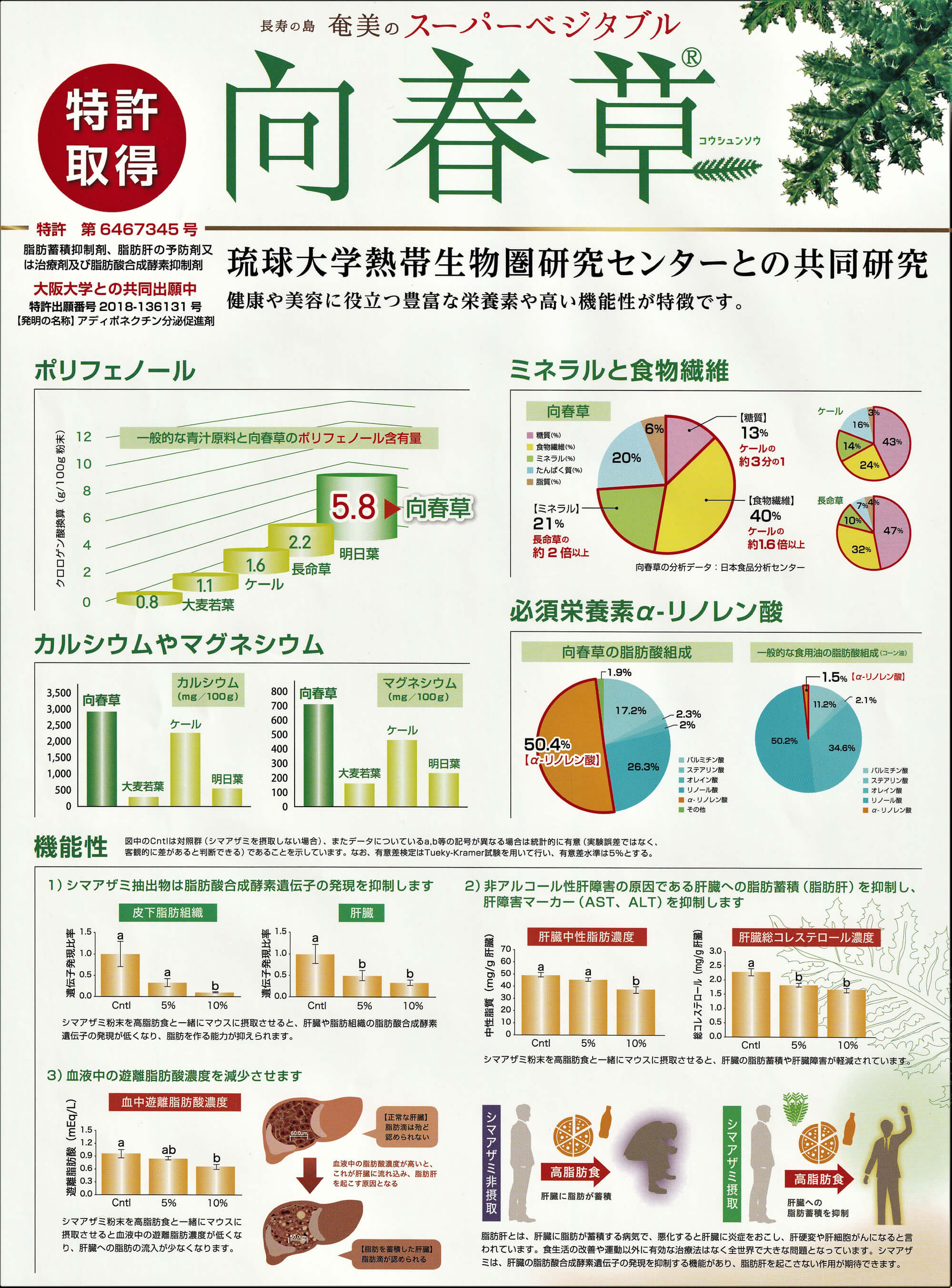カルシウムやマグネシウム含有量は大麦若葉、ケール、明日葉等と比べ群を抜いて多く含まれる他、ミネラルは長命草の約2倍、食物繊維はケールの1.6倍以上含まれます。